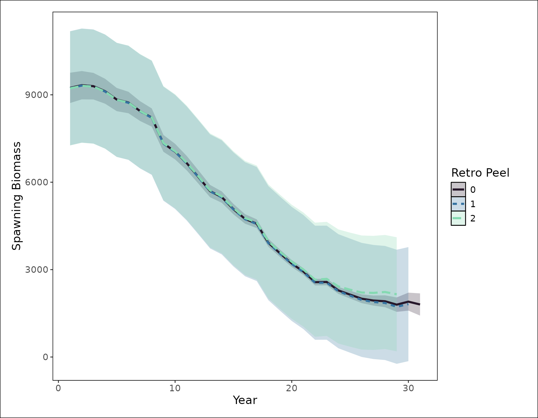 ggplot2::labs(x = "Year", y = "Spawning Biomass") +
