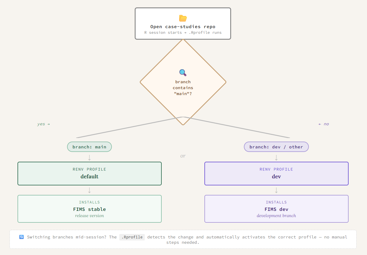 {FIMS} is continuously in active development and since both projects rely heavily on {FIMS}, it’s really important that we are keeping track of what version of {FIMS} we are using. For example, when we are writing functions for {FIMSdiags} and find a bug in {FIMS}, we can switch to using the version with the fix until that fix is merged into the dev or main branch at a later time. Using the {renv} functions to install and update the lockfile with the specific version of {FIMS} makes this really easy to do. For the case studies, this challenge was more complex. We wanted to ensure there was always a version of the case studies that works with the stable version of {FIMS}, but we also want to be able to test them with features being added into the development branch of {FIMS}. To do this, we took advantage of its profiles feature to be able to seamlessly switch between multiple versions of {FIMS} for the case studies. We created two {renv} profiles, each with their own R libraries. The profiles are determined by which branch of the case studies repository you are working on. If your R session detects “main” in the branch name it will automatically use the default profile which uses the stable version of {FIMS}. Otherwise, it will activate the dev profile and therefore, the user will be using the development version of {FIMS}.